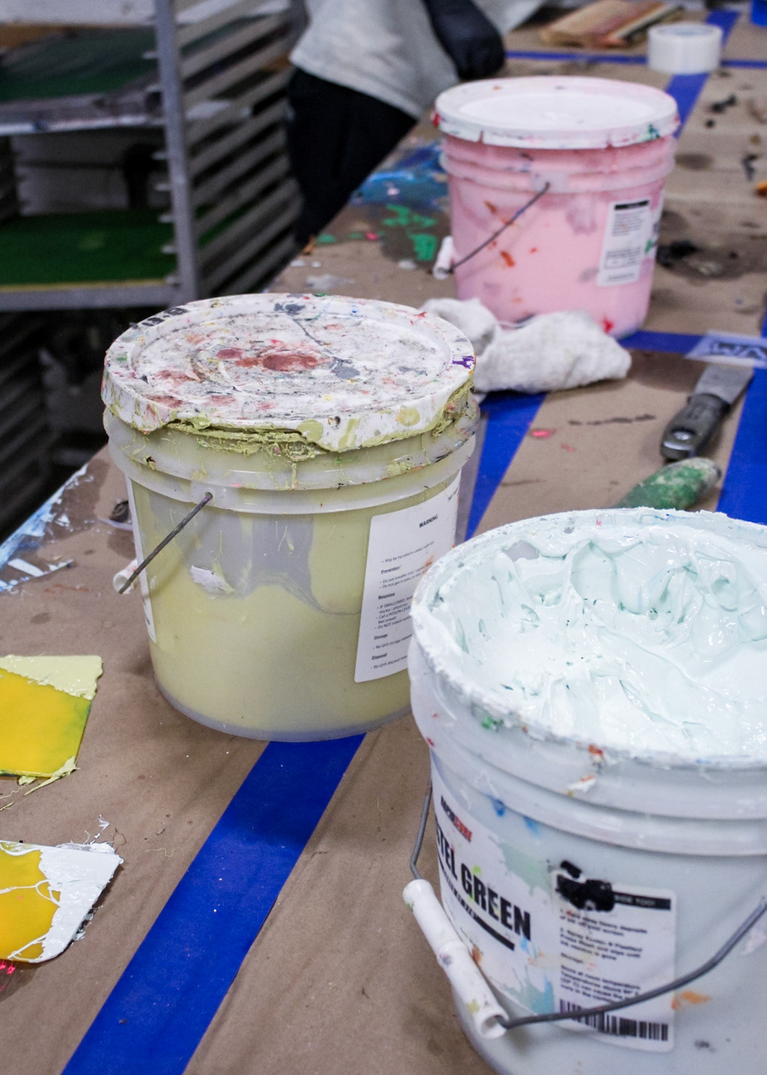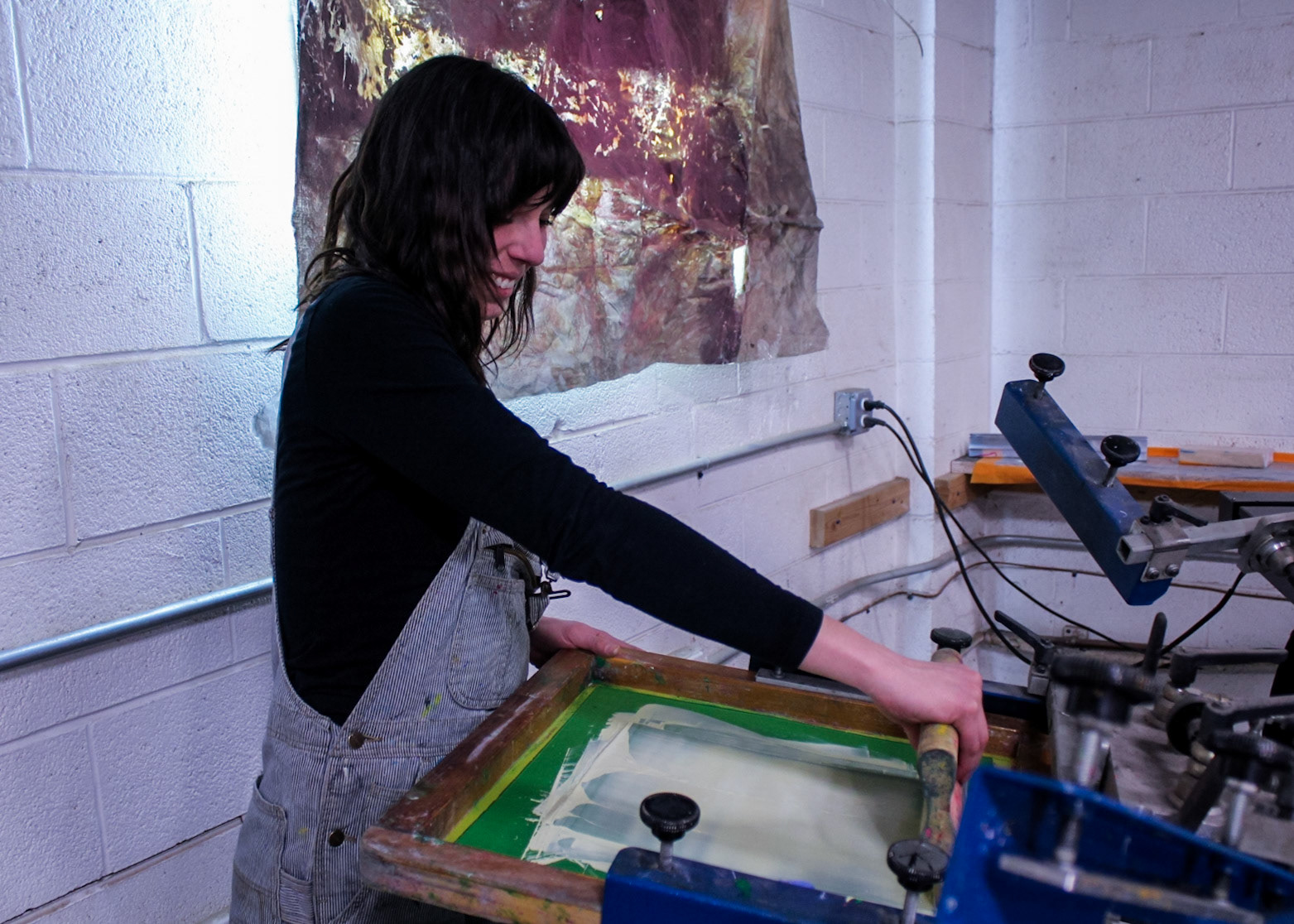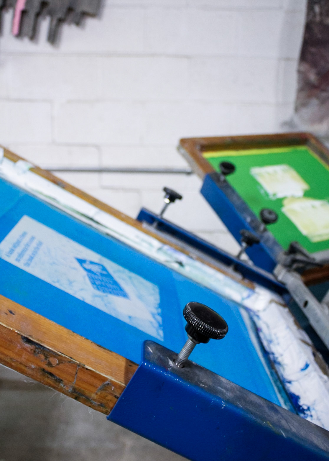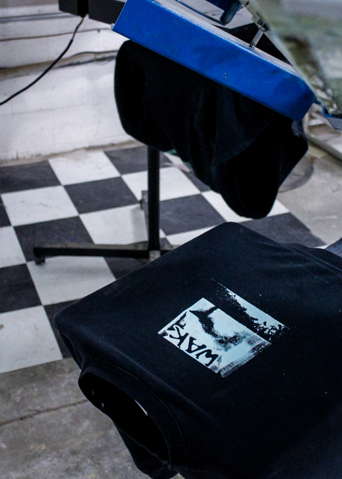 "One day screen print stuff showed up from with two guys and a truck in Core City. There it sat at a collective weight of 3000 lbs in a disassembled state. One chain fall, three dolly carts, an engine hoist ken come in handy, and Ken had access to another process.