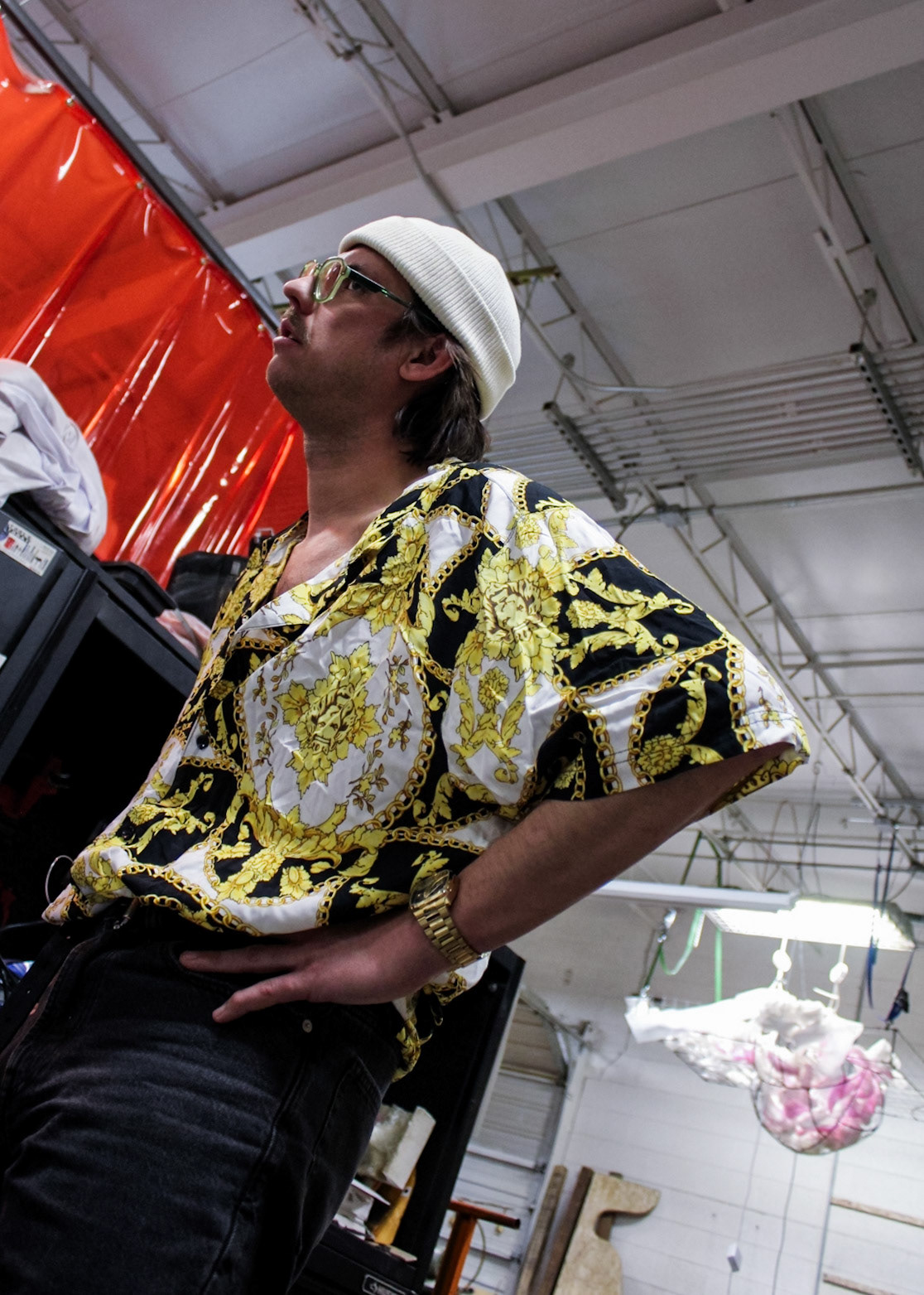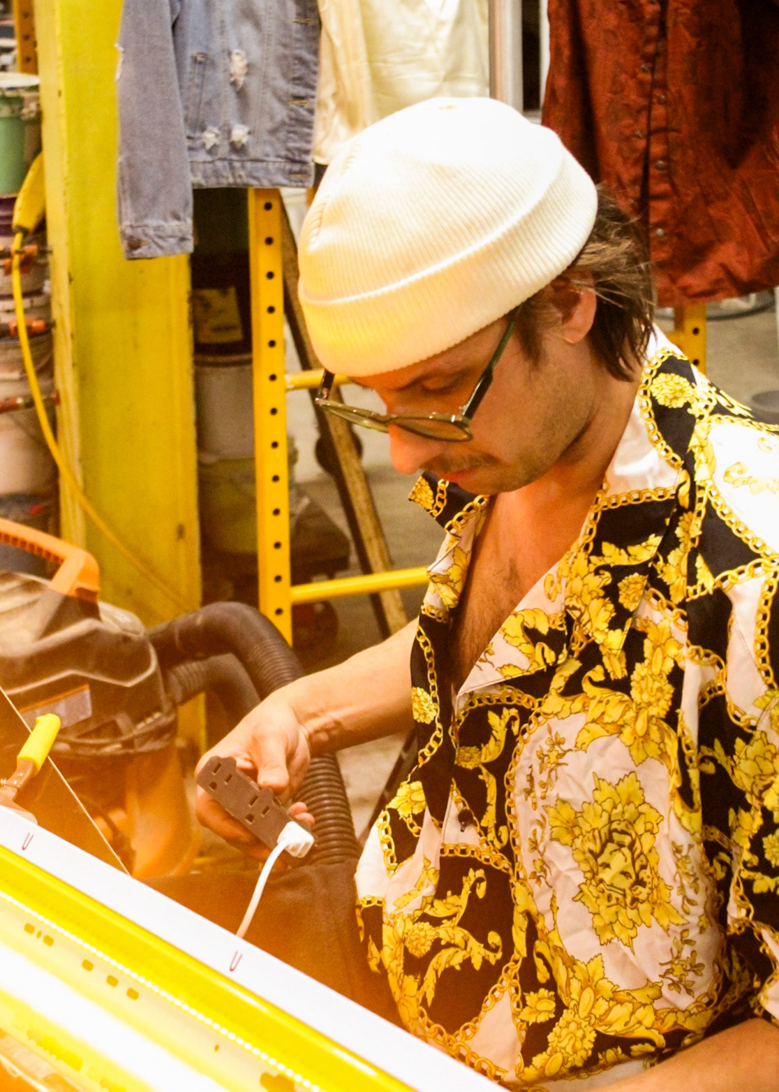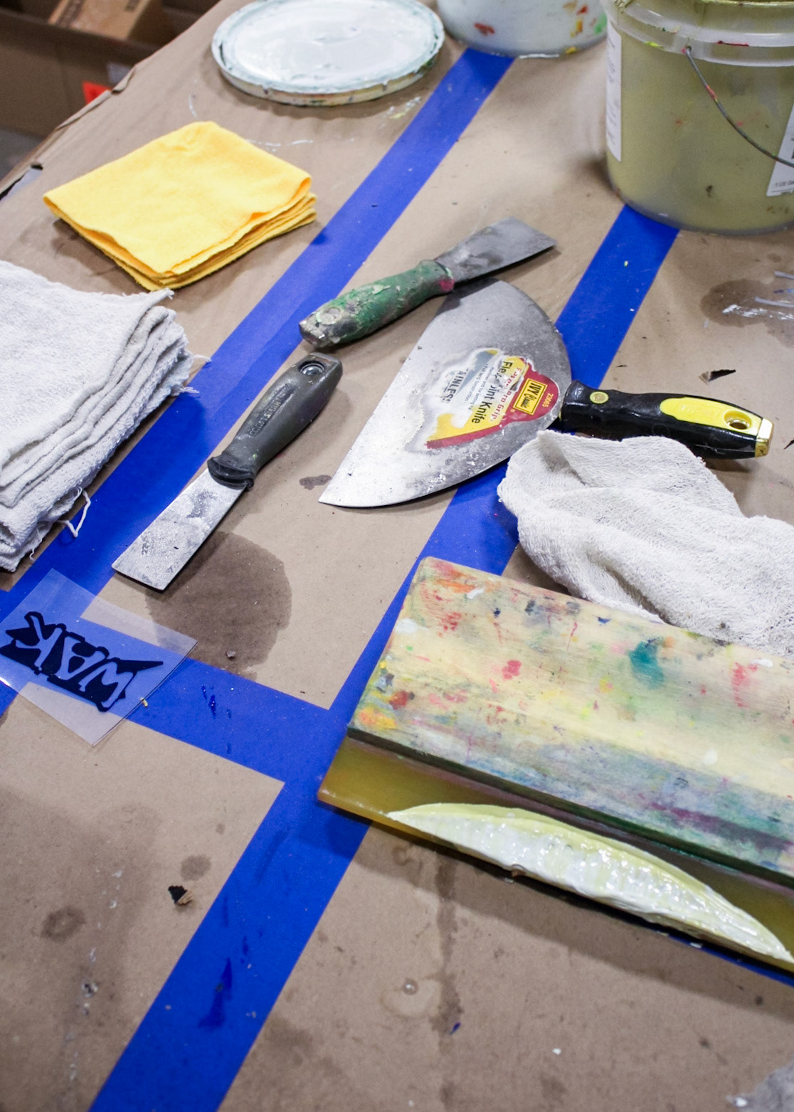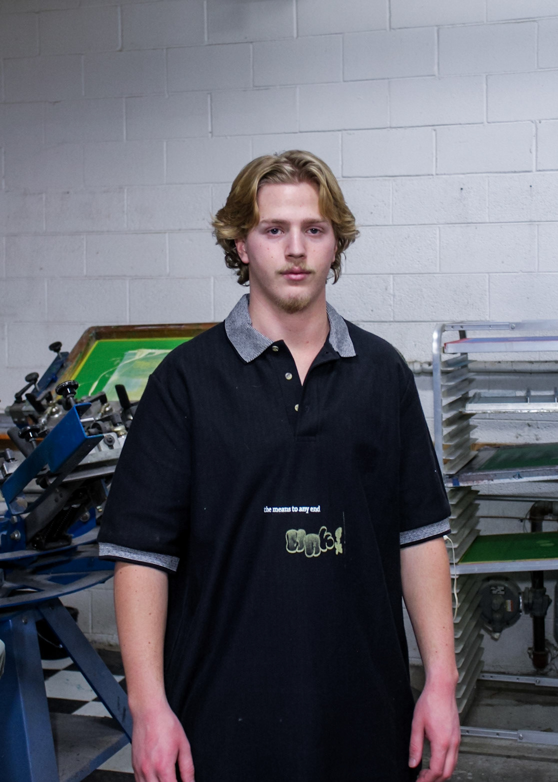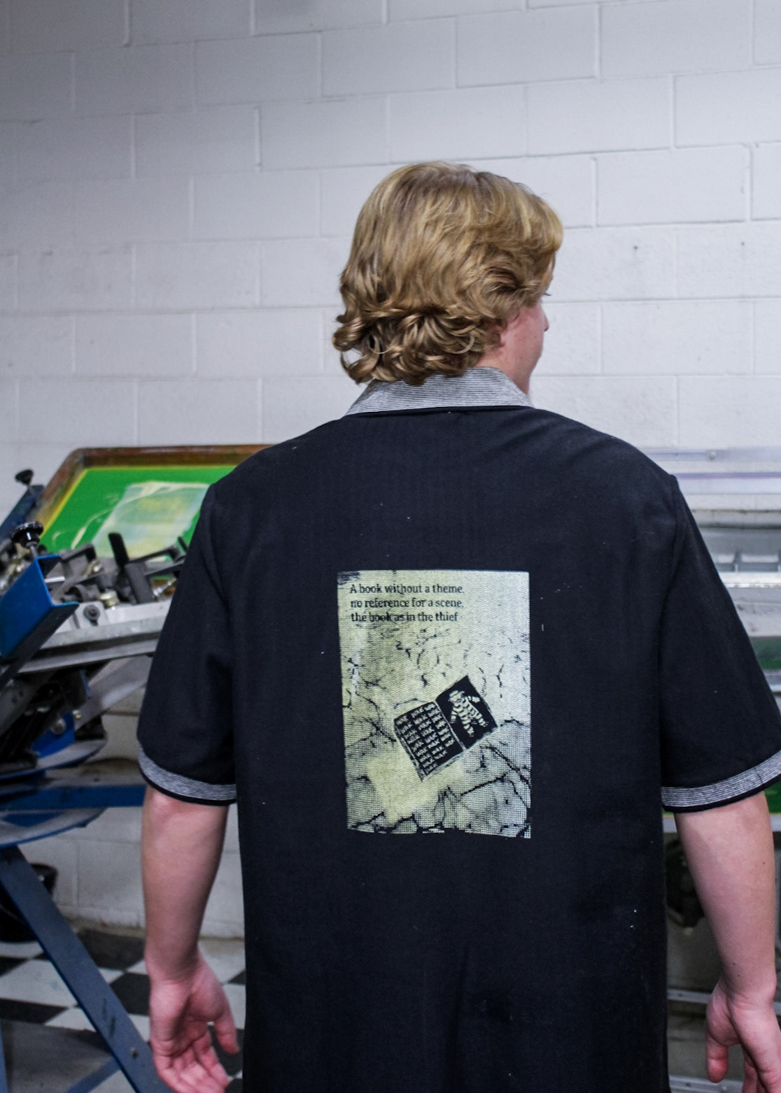 "One day screen print stuff showed up from with two guys and a truck in Core City. There it sat at a collective weight of 3000 lbs in a disassembled state. One chain fall, three dolly carts, an engine hoist ken come in handy, and Ken had access to another process.